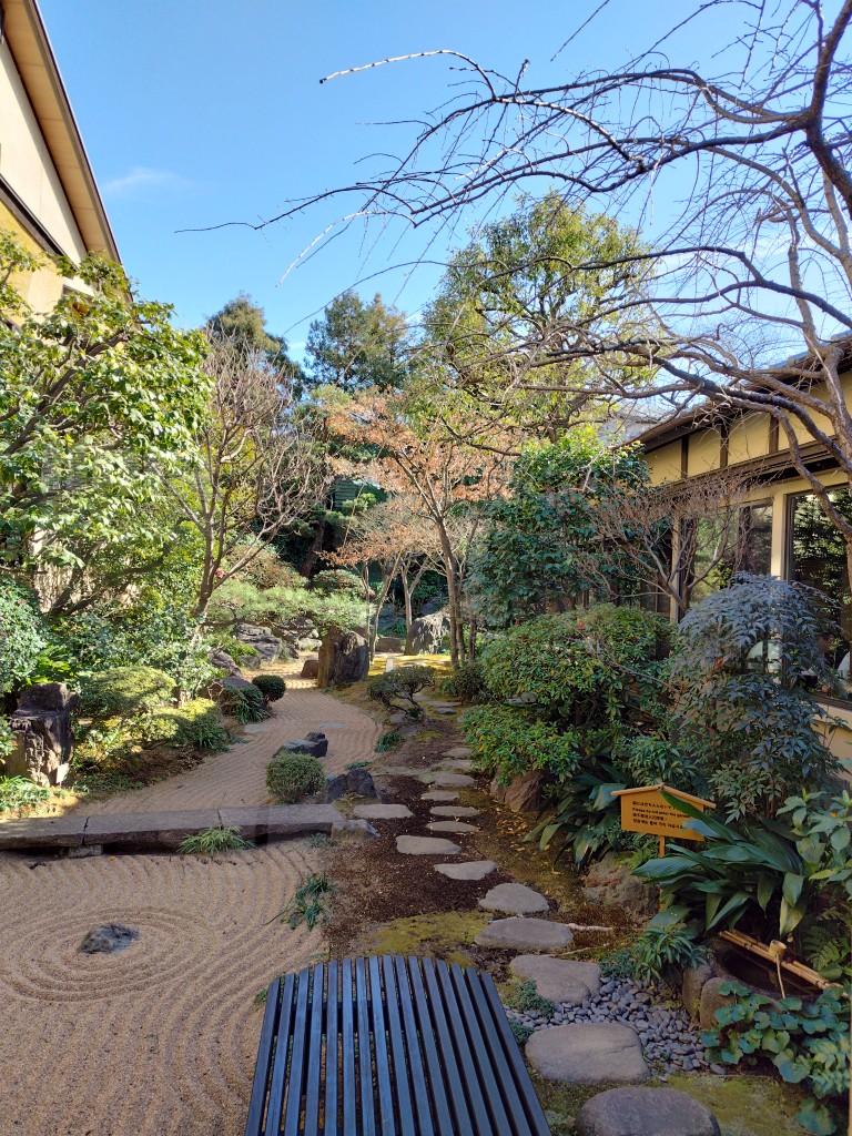 当日は晴れ。北風は多少あったが、壺湯に浸かり空を見上げれば雲一つない青空に庭木の緑が目に入る。