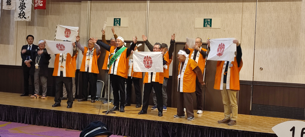 開会式の幹部の挨拶の後、塩塚 保鳳陽会東京支部長が檄を飛ばし、その後、各校が壇上に登壇し、寮歌を熱唱しました。